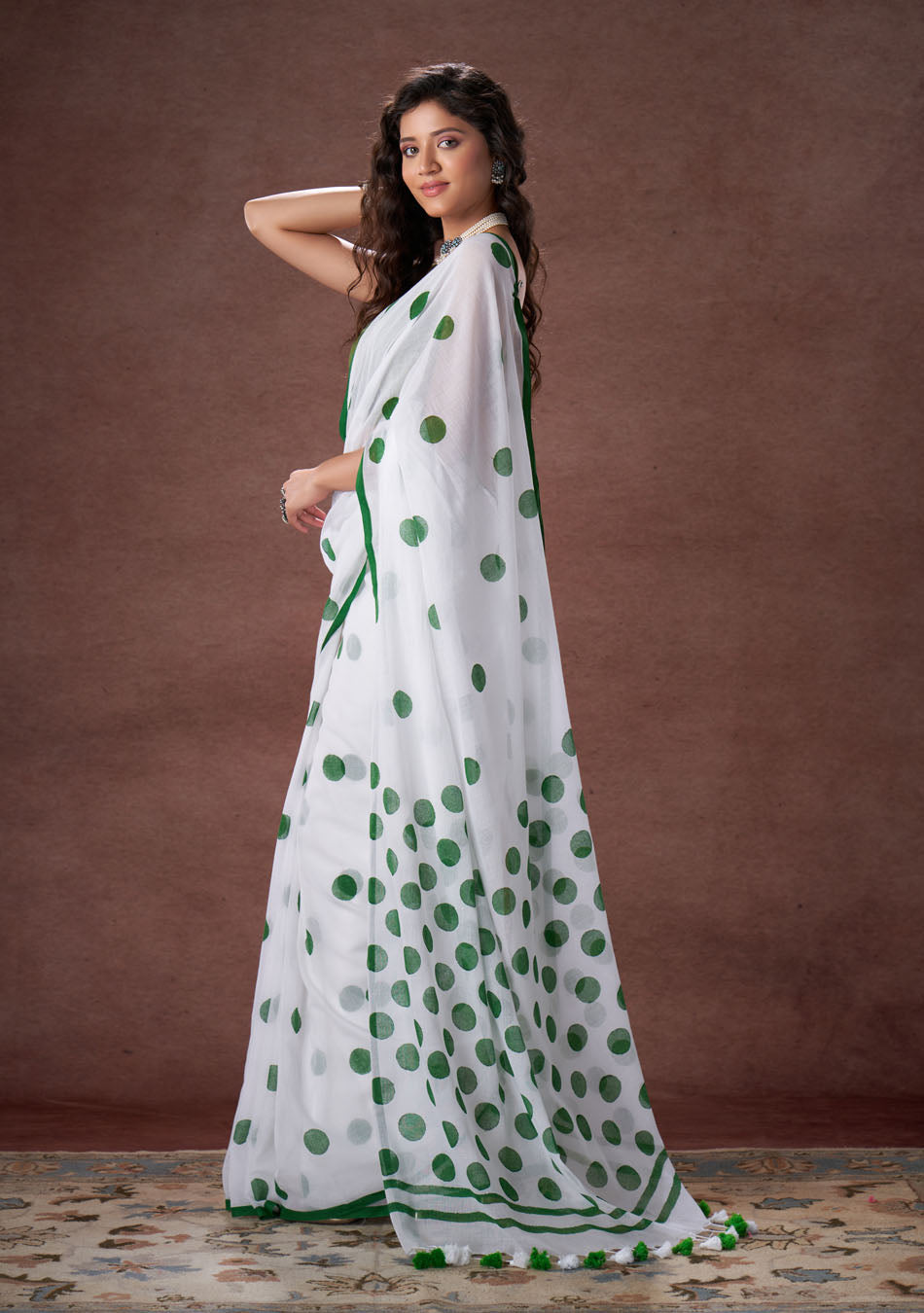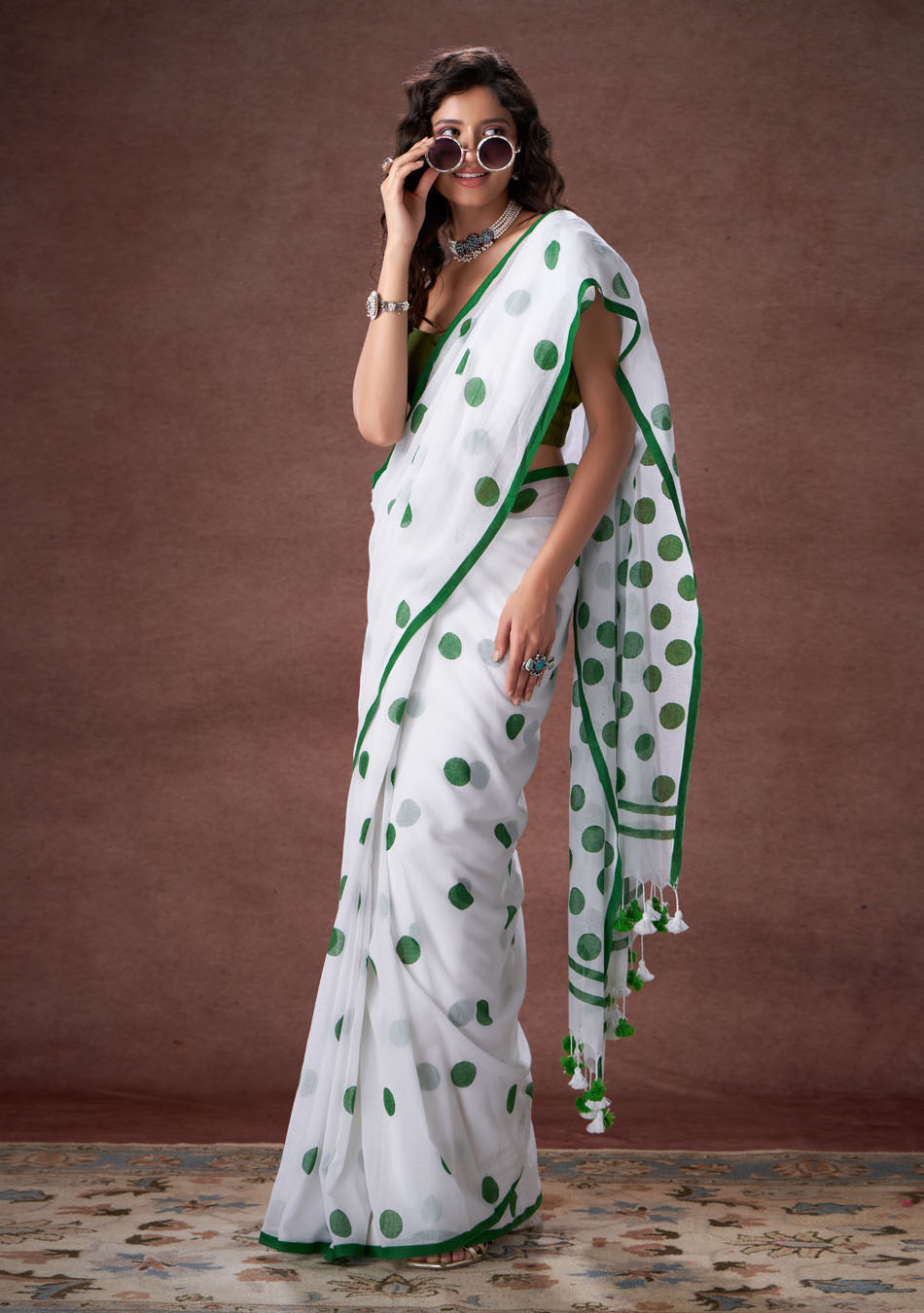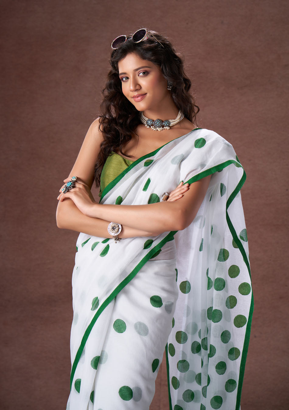 The mulmul saree with overlapping polka dot is your new fashion style.