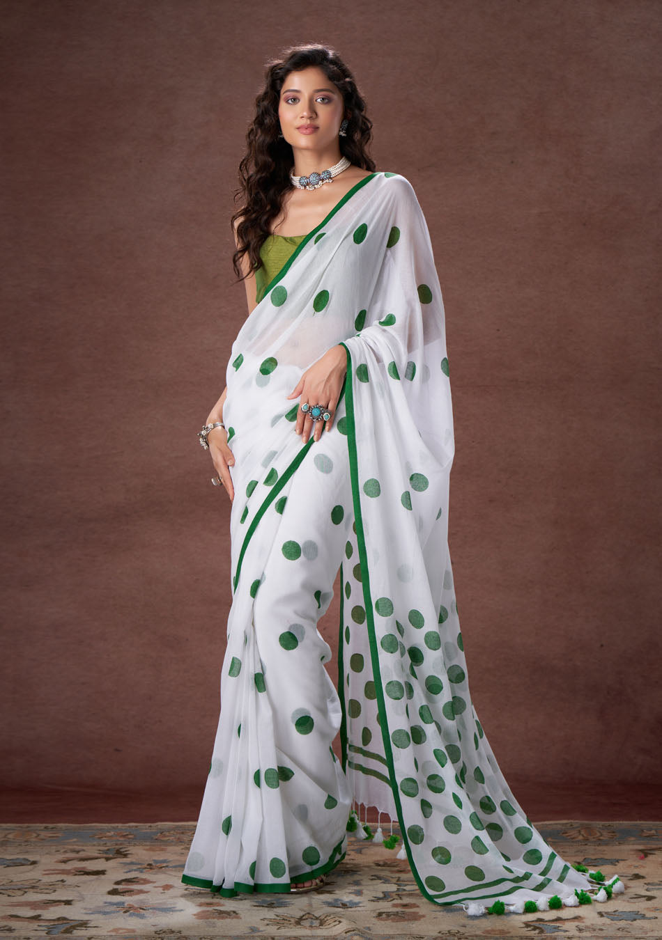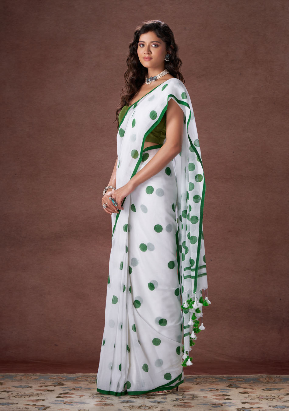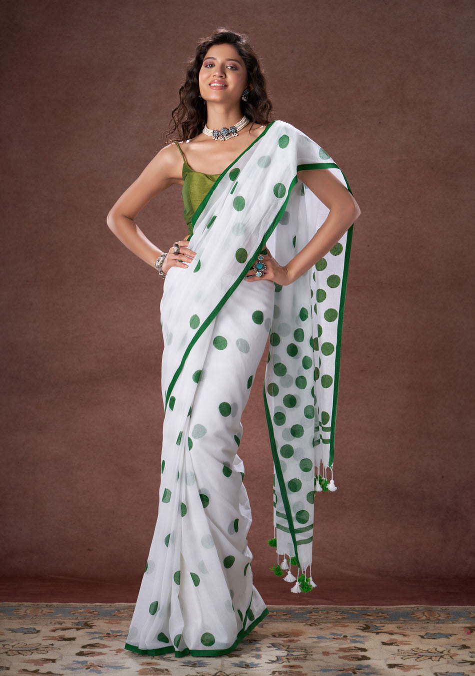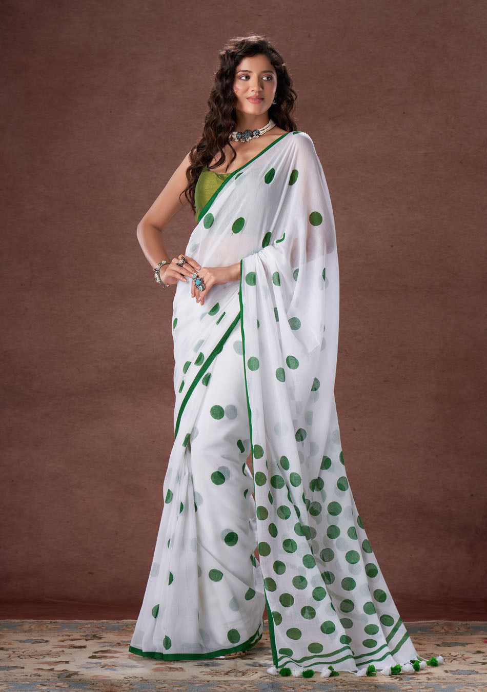 The mulmul saree with overlapping polka dot is your new fashion style.