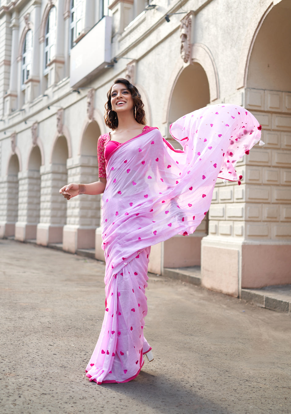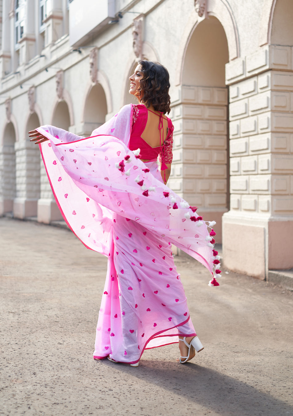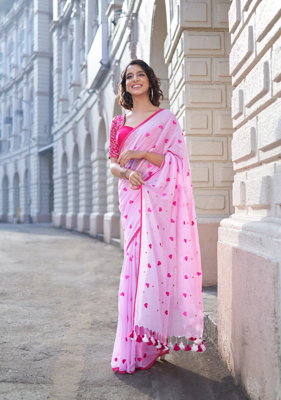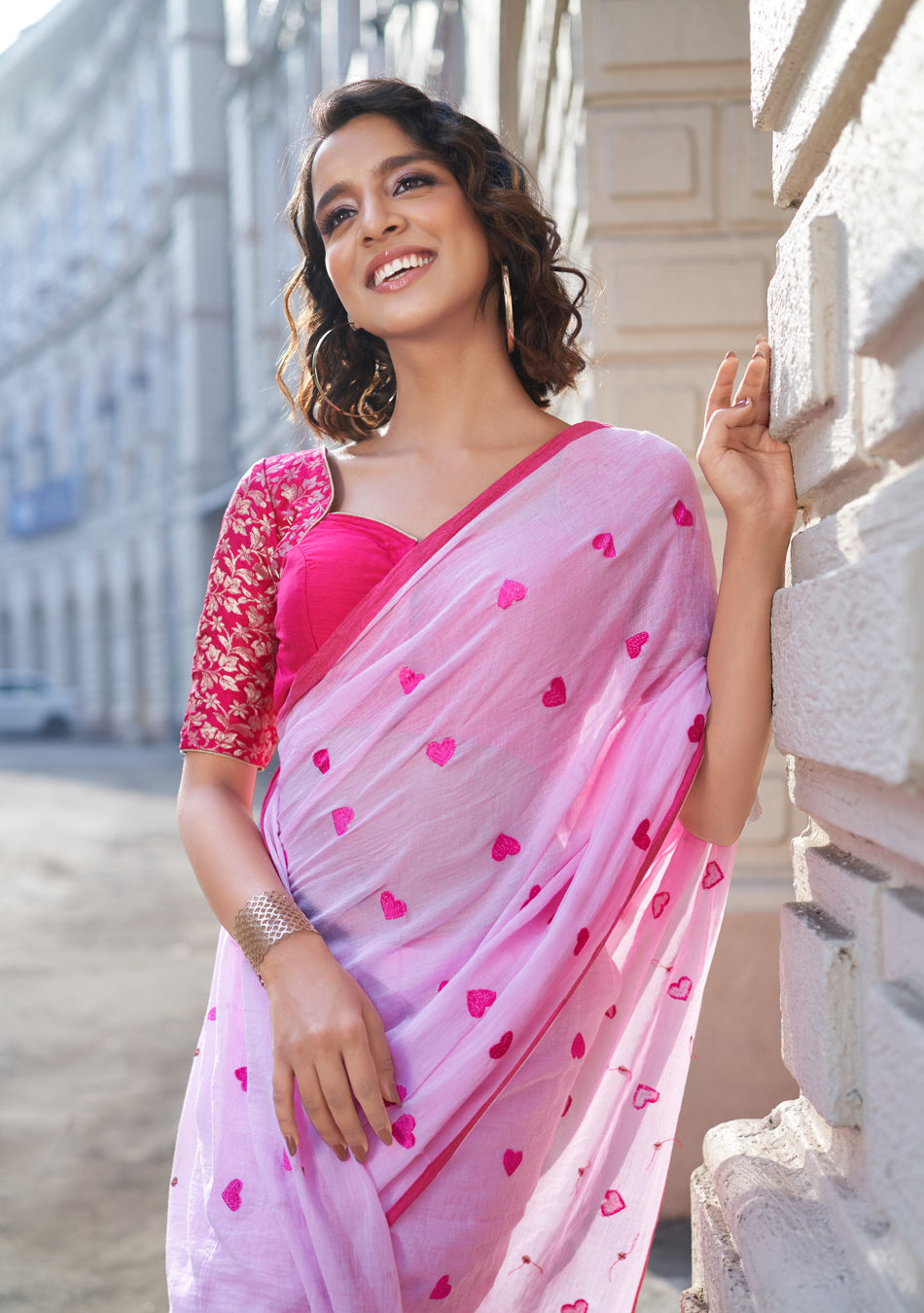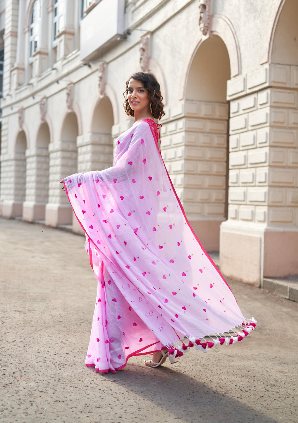 The Little Hearts Mulmul Saree is soft, light, and breathable. Made from fine mulmul cotton, it feels smooth on the skin and keeps you comfortable all day. The delicate heart patterns add a sweet and charming touch, making it perfect for any occasion.