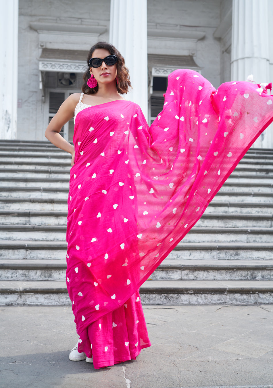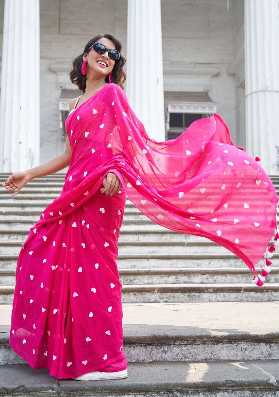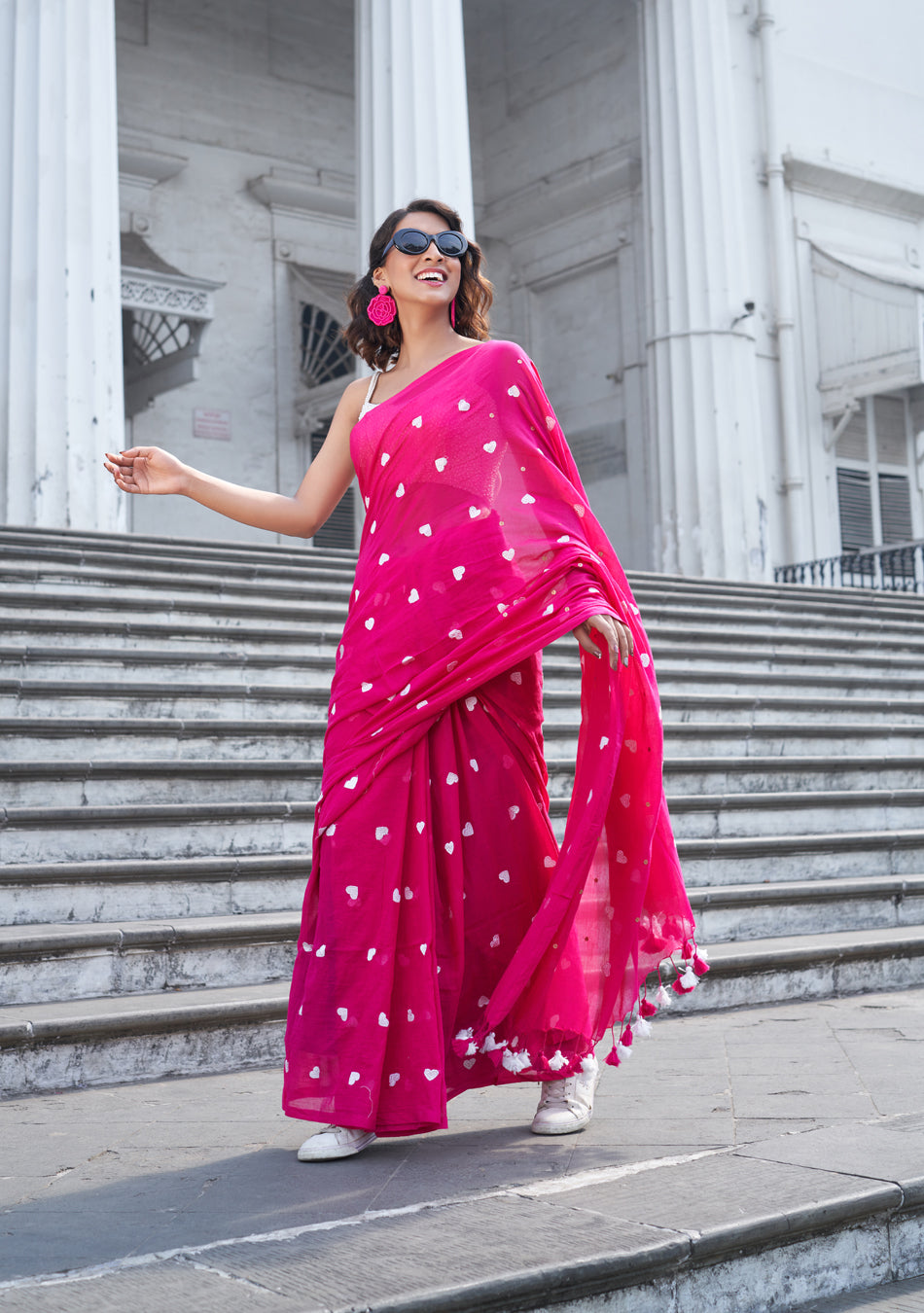 This Meri Rani Saree is soft, light, and comfortable. Made from mulmul cotton, it feels smooth on the skin. The beautiful pink color adds a graceful touch, making it perfect for any occasion.