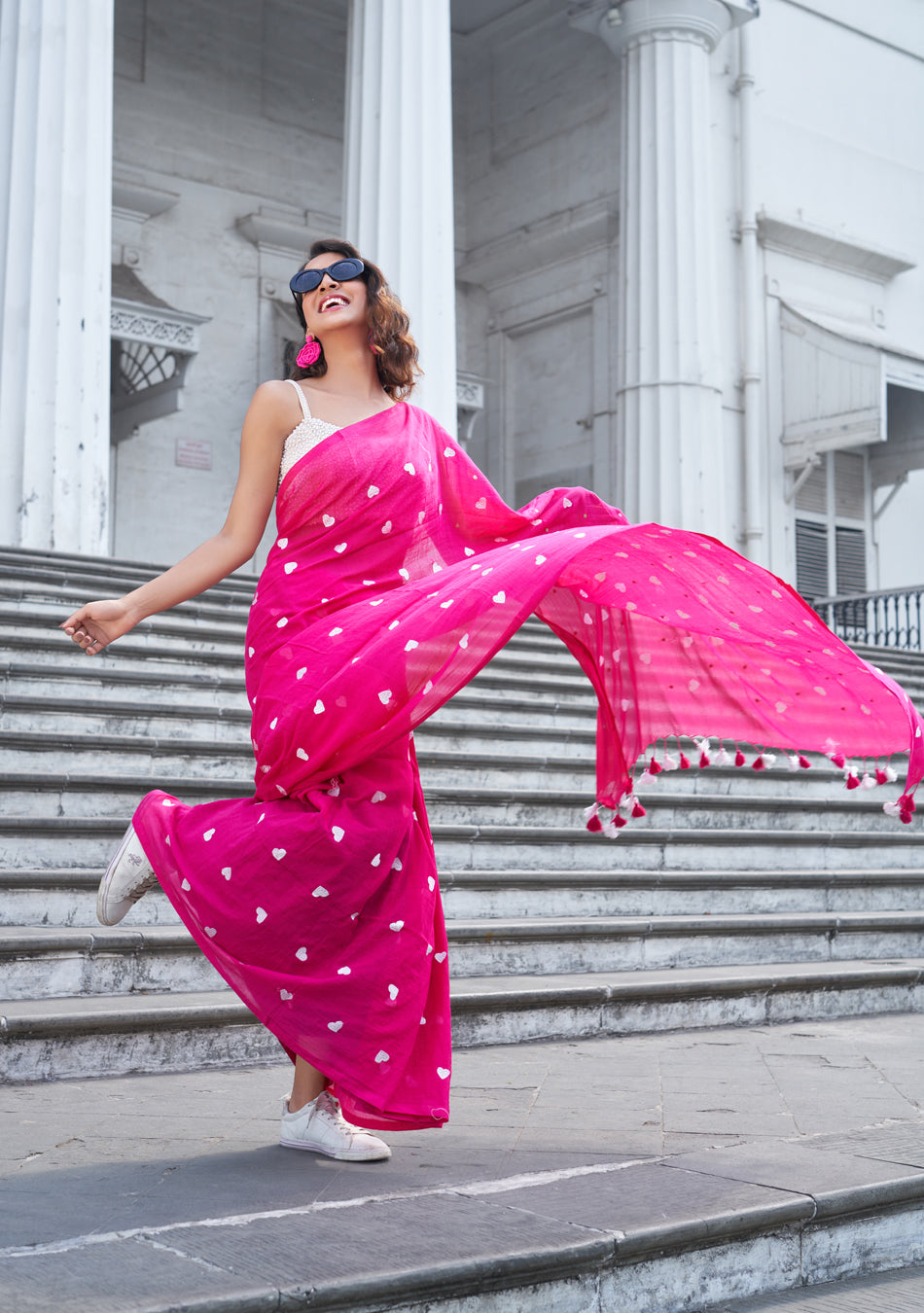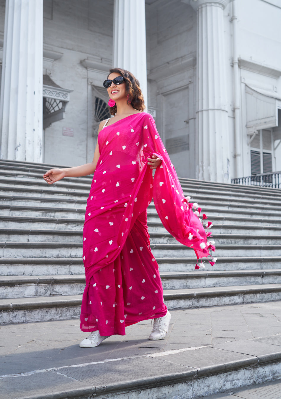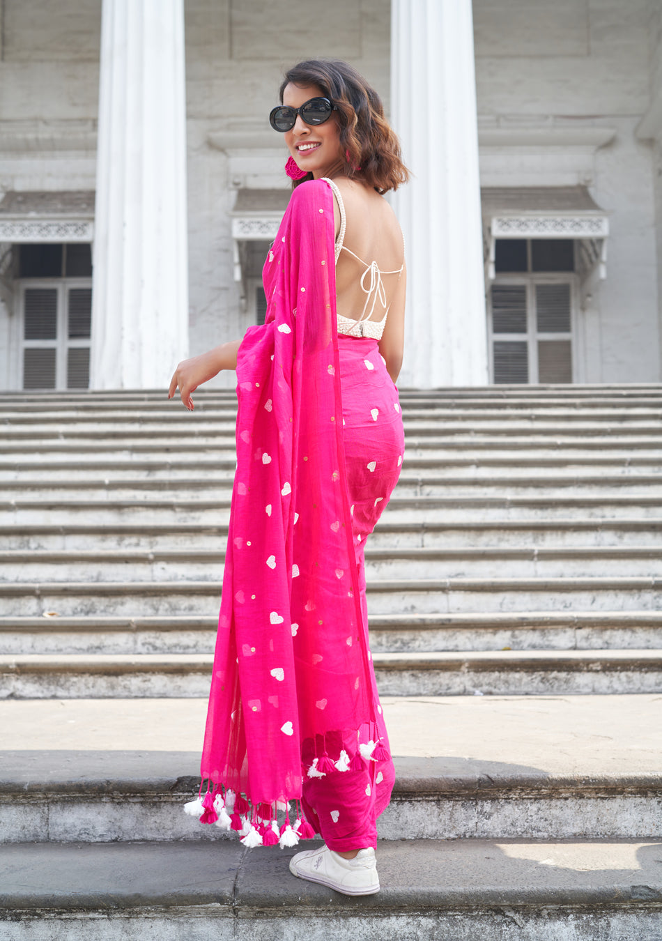 This Meri Rani Saree is soft, light, and comfortable. Made from mulmul cotton, it feels smooth on the skin. The beautiful pink color adds a graceful touch, making it perfect for any occasion.