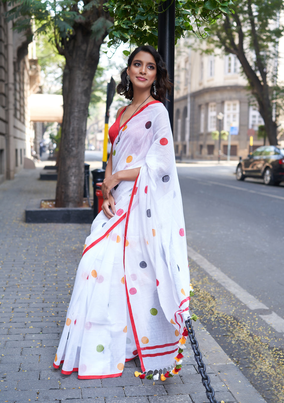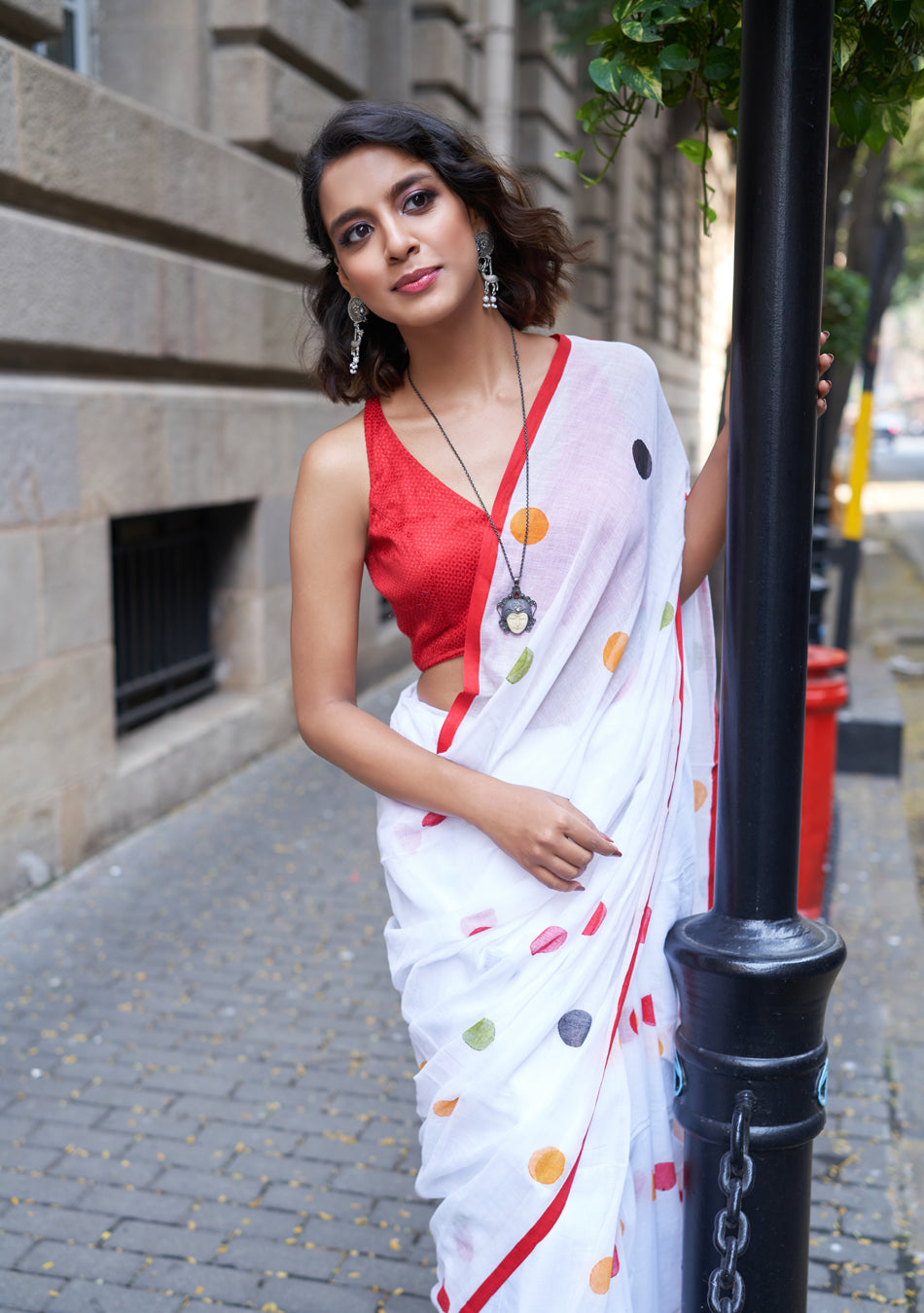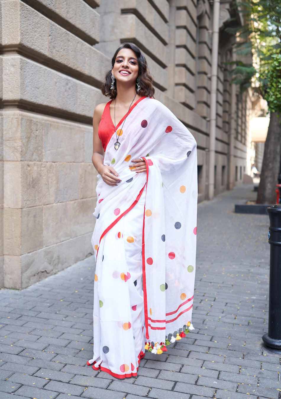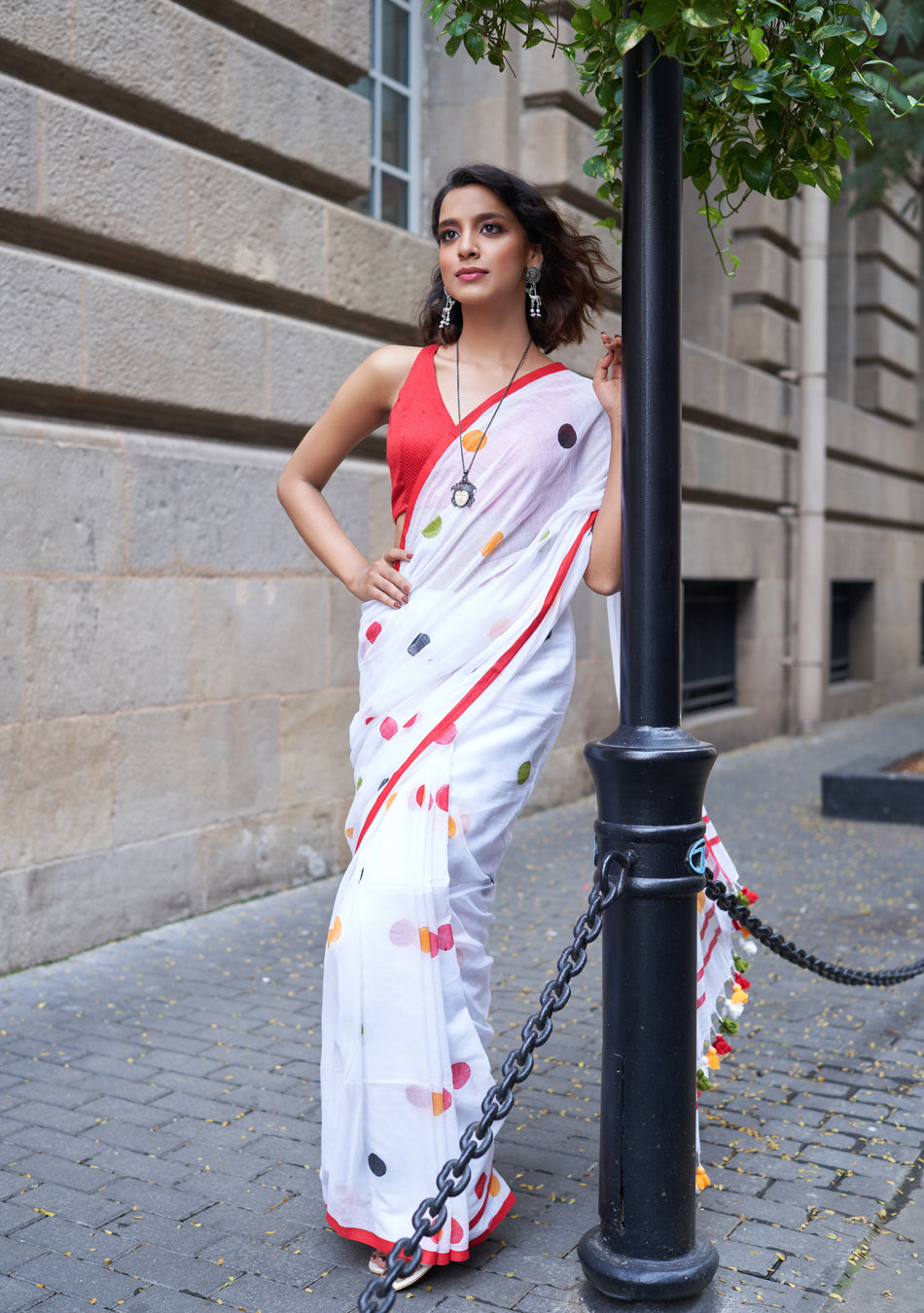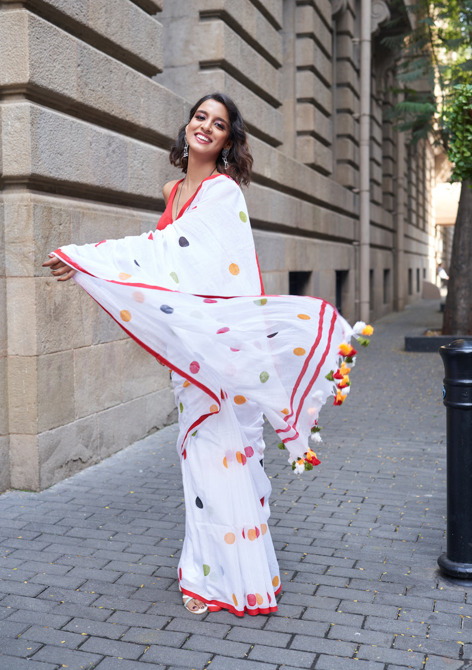 The Polka Dot Mulmul Saree is soft, light, and comfortable. Made from mulmul cotton, it feels smooth on the skin and is perfect for all-day wear. The white mulmul fabric with polka dots gives it a stylish and elegant look, making it great for any occasion.