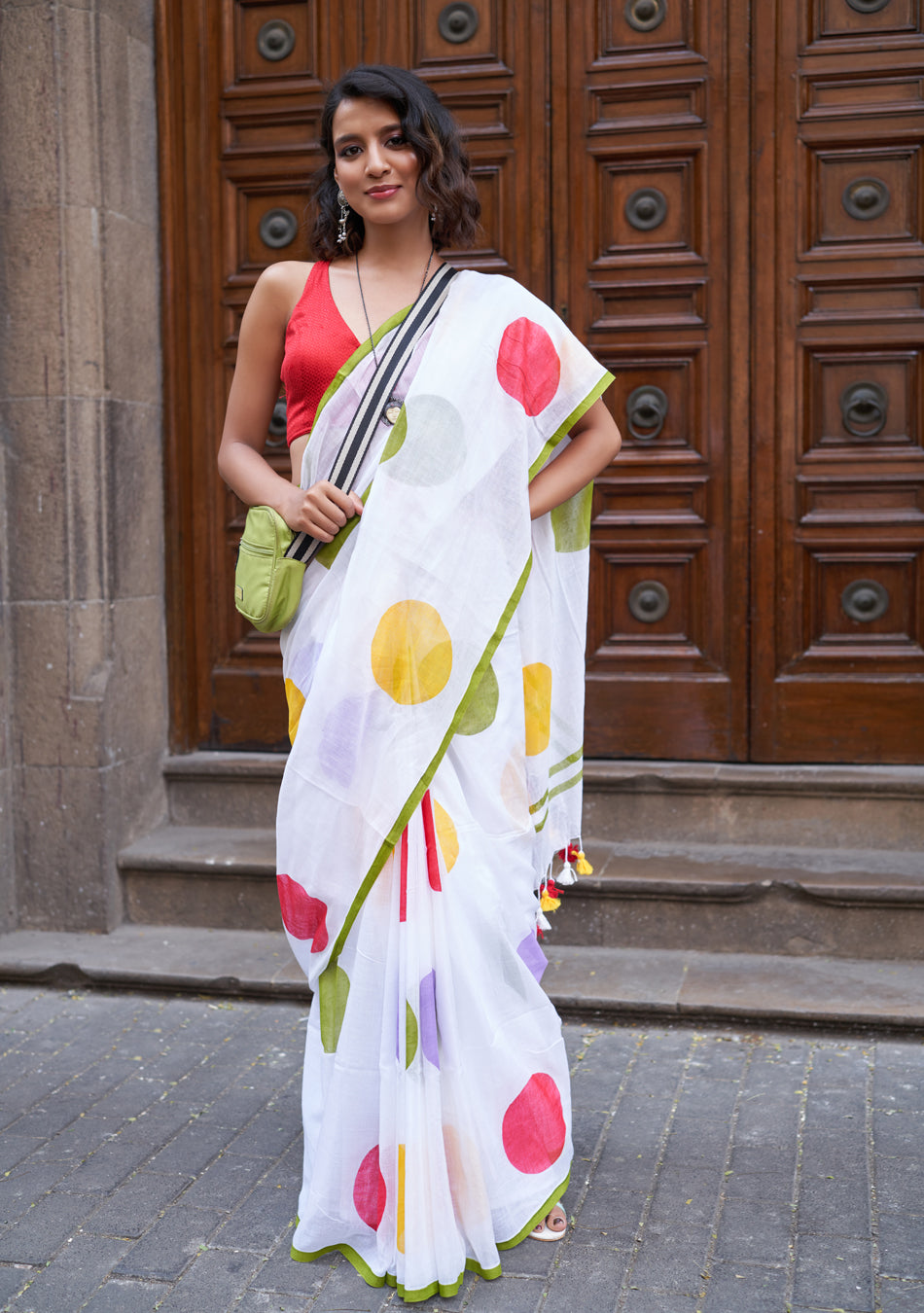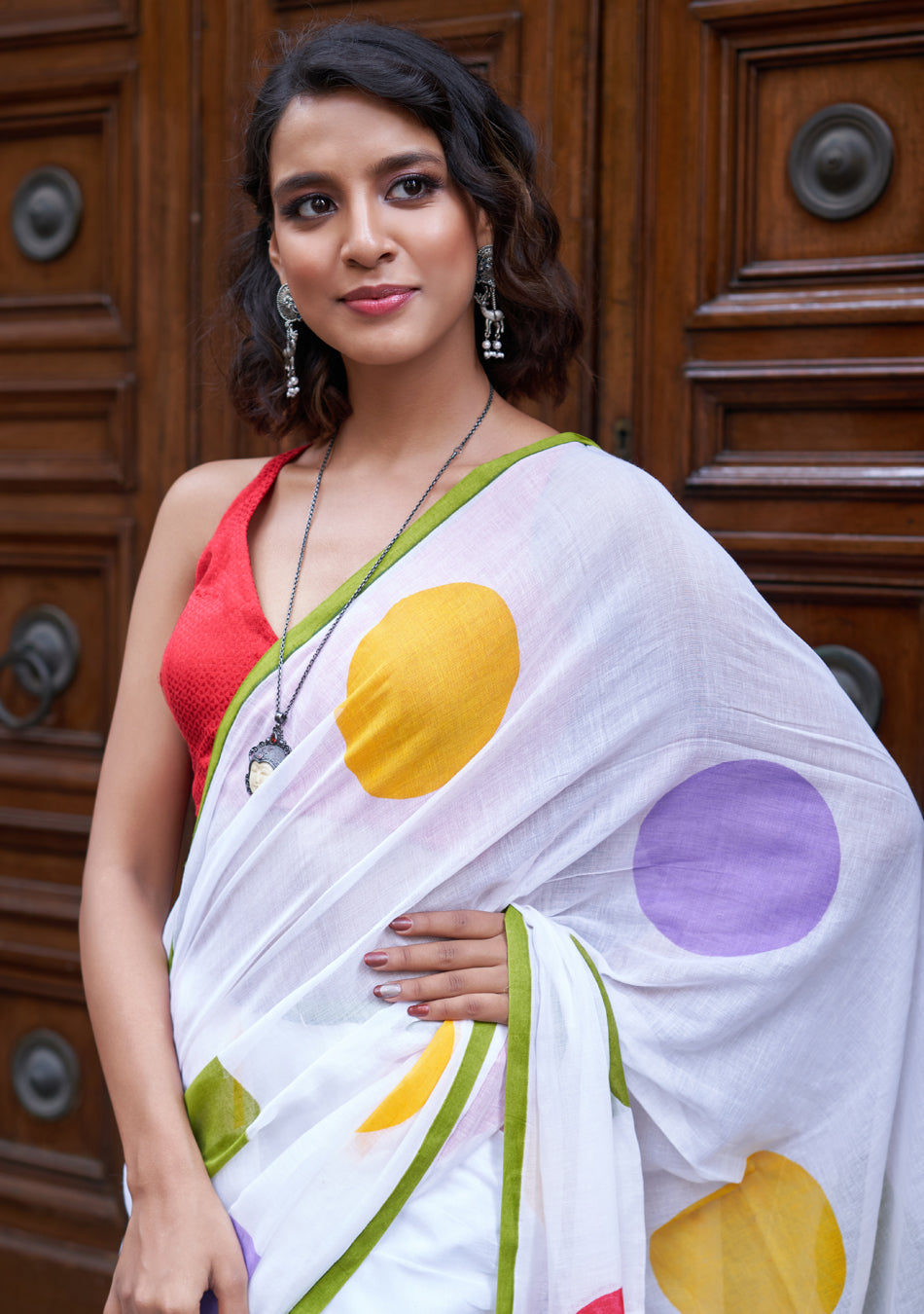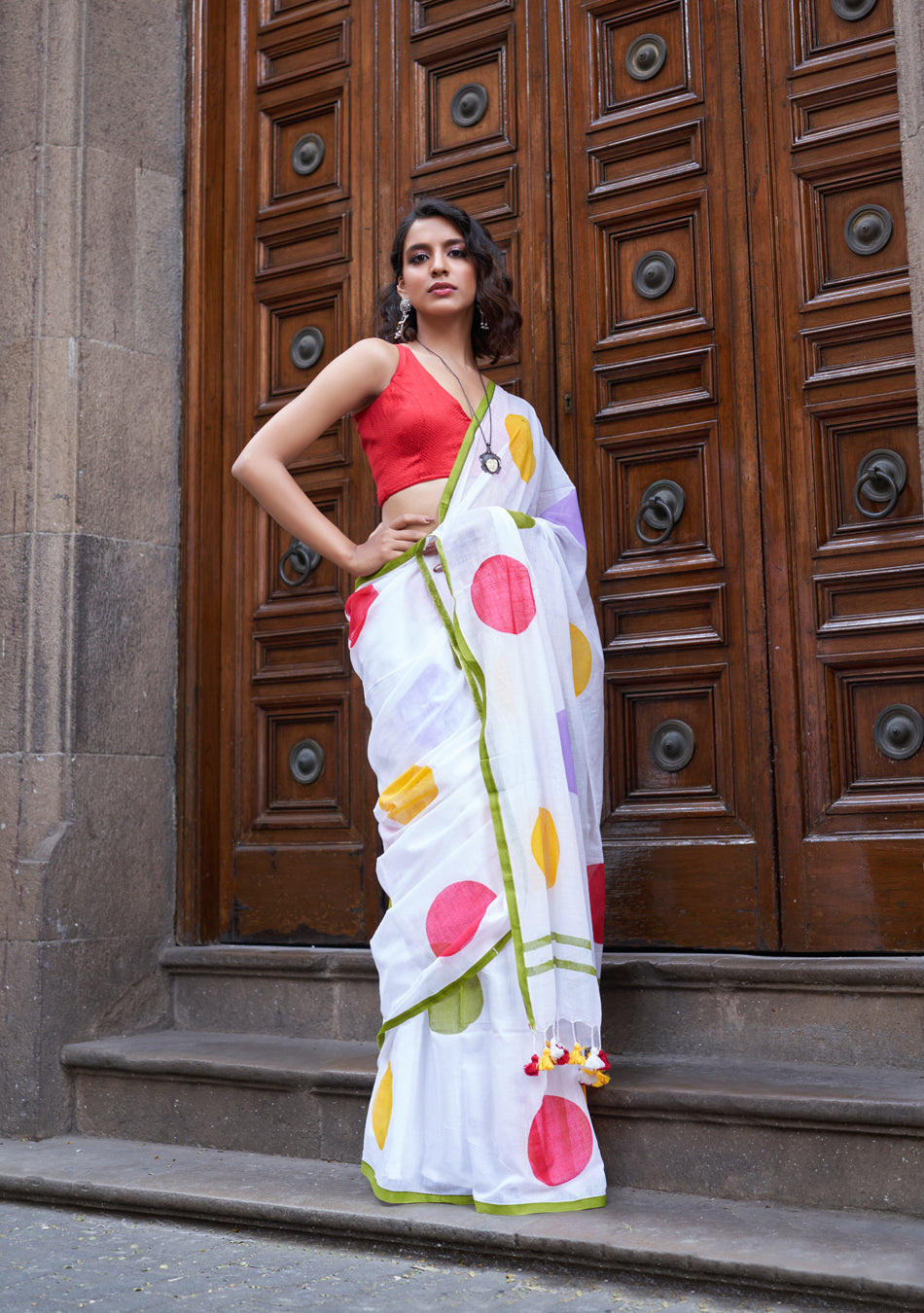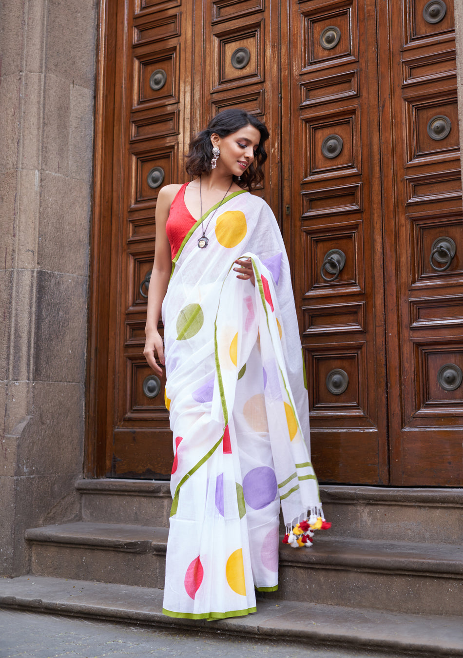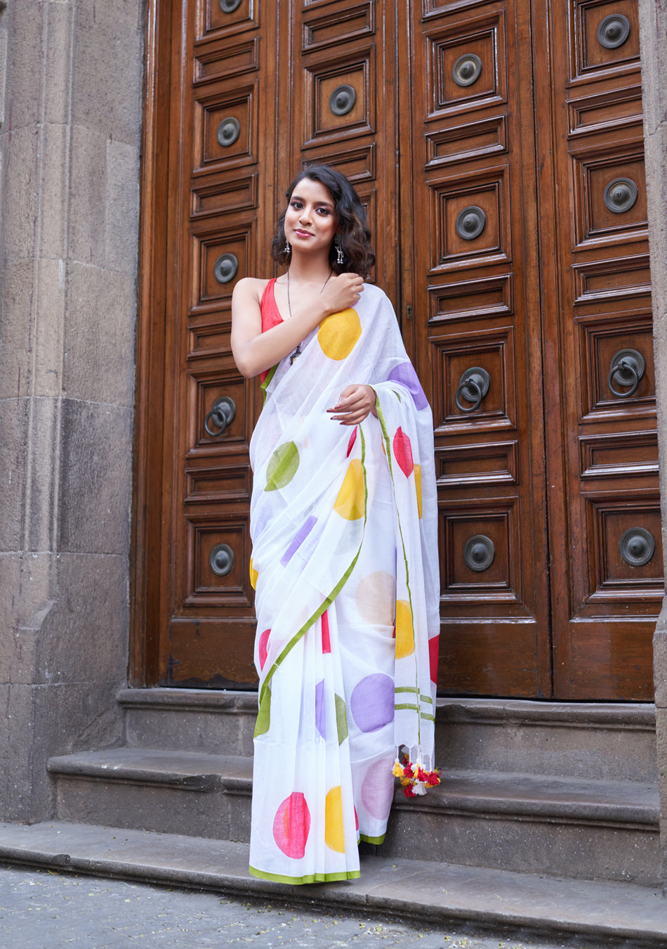 The Polki Mulmul Saree is soft, light, and comfortable. Made from mulmul cotton, it feels smooth on the skin. The white mulmul fabric with stylish dot patterns adds a classic touch, making it perfect for every occasion.